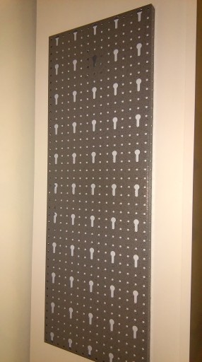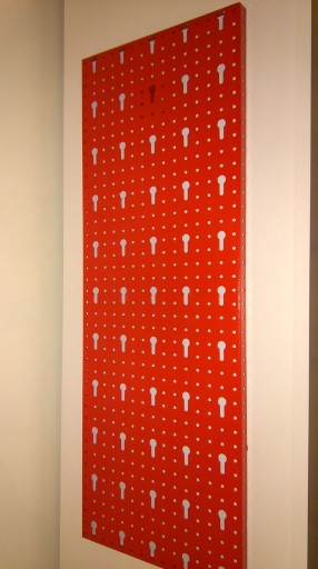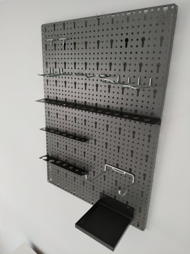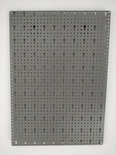 Płyty perforowane dostępne w kolorze szarym, niebieskim, czerwonym oraz czarnym o wymiarach 450x630x15 mm. Płyty lakierowane metodą proszkową w naszej malarni, posiadają zamaskowane uchwyty montażowe do ściany. Grubość blachy to 0,8 mm perforacja co 10 mm zarówno w poziomie jak i w pionie. Waga jednej płyty to ok 1,4 kg.