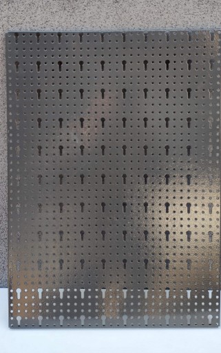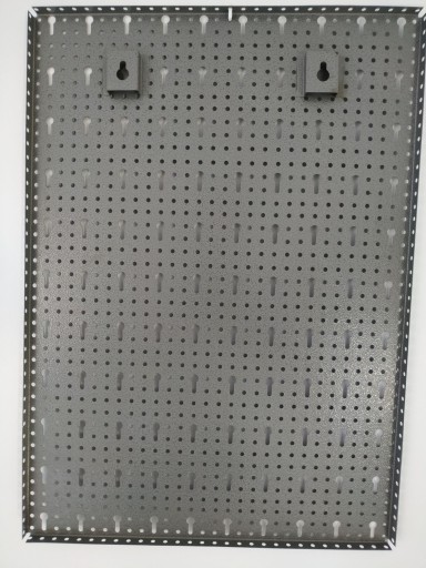 Płyty perforowane dostępne w kolorach szarym, czarnym, niebieskim oraz czerwonym. Płyty malowane metodą proszkową w naszej malarni, posiadają zamaskowany uchwyt montażowy do ściany. Grubość blachy to 0,8 mm perforacja co 10 mm zarówno w poziomie jak i w pionie. Waga jednej płyty to ok 0,7 kg.