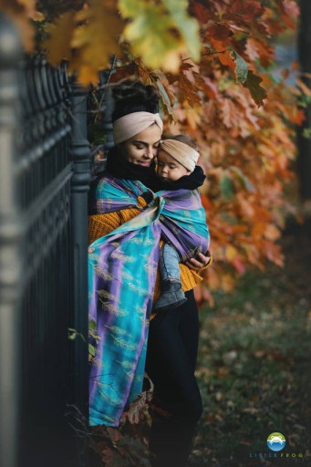 Chusta kółkowa Little Frog to szybkie, proste w użyciu i zajmujące niewiele miejsca nosidełko dla dziecka. Nie wymaga skomplikowanego wiązania chusty! Wystarczy dobrze przełożyć chustę do noszenia dziecka przez kółka, dopasować rozmiar do osoby noszącej włożyć dziecko i dociągnąć (według wskazówek w instrukcji). To niezbędny element wyprawki noworodka