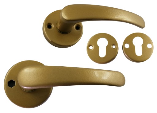 KLAMKA DRZWIOWA BISZKOPT z okrągłym szyldem + DOLNA ROZETA na WKŁADKĘ BĘBENKOWĄ (z płaskim kluczem)