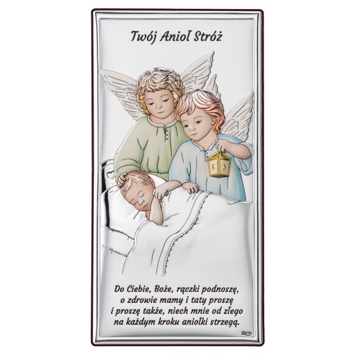 Obrazek srebrny z wizerunkiem Aniołków z latarenką czuwających nad dzieciątkiem stanowi idealny prezent z okazji Chrztu Świętego. Z przodu obrazka został fabrycznie wygrawerowany napis "Twój Anioł Stróż" oraz tekst modlitwy: "Do Ciebie, Boże, rączki podnoszę, o zdrowie mamy i taty proszę i proszę także, niech mnie od złego na każdym kroku aniołki strzegą..".