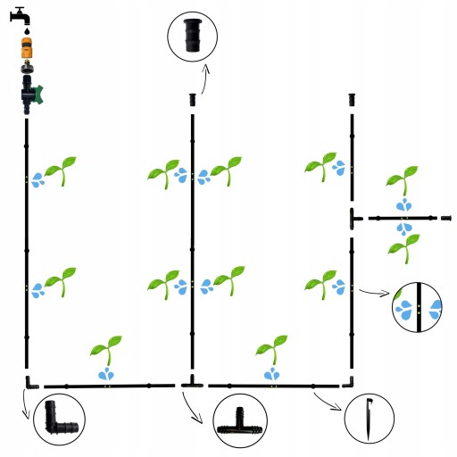 Linia kroplująca dzięki dołączonym w zestawie złączkom może zostać ułożona w dowolny sposób. Oto przykładowe rozmieszczenie