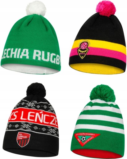 Czy czapka musi posiadać haftowany herb? Nie. Można go zastąpić wkomponowanym we wzór dzianym napisem – np. nazwą drużyny (brak haftu obniży cenę).