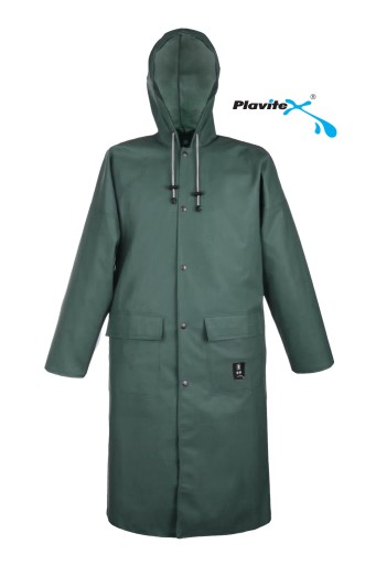 Płaszcz zapinany na napy, z kapturem i dwiema bocznymi kieszeniami przykrytymi patkami. Model produkowany z wodoochronnej tkaniny Plavitex, przeznaczony do użytku w niesprzyjających warunkach pogodowych. Zapewnia skuteczną ochronę przed wiatrem i deszczem. Technika obustronnego zgrzewania zwiększa wytrzymałość szwów. Produkt spełnia standardy europejskich norm: EN ISO 13688 i EN 343.