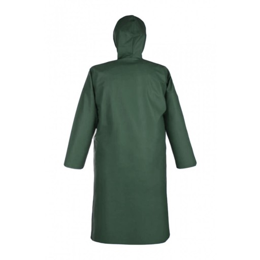 Płaszcz wykonany techniką obustronnego zgrzewania, która zwiększa wytrzymałość szwów. Długość płaszcza zabezpiecza pracownika przed ściekaniem wody na uda i kolana.