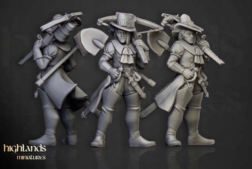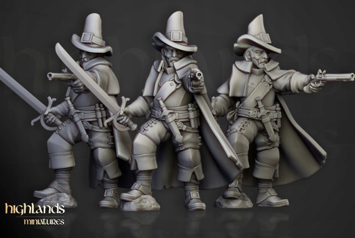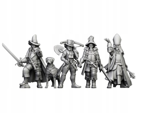 Przedmiotem oferty jest zestaw pięciu modeli Inquisitorial Band od Highlands Miniatures, wydrukowanych na drukarce 3D w technologii SLA.