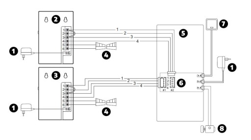 Dwurodzinny domofon wyposażony jest w 2 białe unifony, czarną kasetę zewnętrzną oraz 3 zasilacze sieciowe DC 12V.