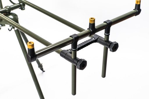 - Stanowisko karpiowe na 3 wędki. W pełni regulowane, praktyczne, sztywne, można ustawiać na terenie płaskim jak i pochyłym. Trzy teleskopowe nogi zapewniają dużą stabilność oraz wiele możliwości ustawień.