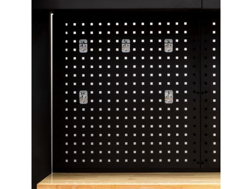 Tylna ściana składa się z dwóch płyt ściennych. Na płytach można zawiesić 10 haczyków dołączonych do zestawu, które doskonale sprawdzą się do zawieszania narzędzi pneumatycznych i kluczy. Wygodne rozwiązanie, gdy chcesz mieć wszystko pod ręką. W zestawie dołączone są dwie płyty.
