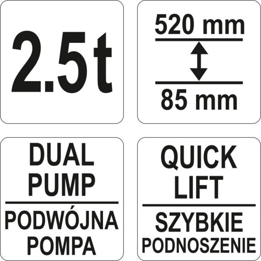 Wysokiej jakości podnośnik samochodowy z dwutłokową pompą. Skonstruowany na zasadzie dźwignika ramieniowego. Posiada napęd hydrauliczny działający w osi poziomej. Niski profil pozwala wsunąć podnośnik pod każde auto, również z niskim podwoziem. Niezbędny w warsztatach samochodowych, serwisach ogumienia i stacjach obsługi pojazdów.