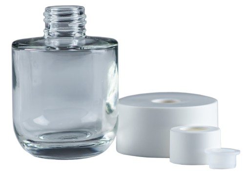 Szklana butelka o pojemności 100 ml z profesjonalną nakrętka 24/410, overcapem oraz zatyczką zapobiegającą wyciekowi podczas transportu/