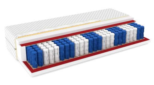 Materac z wkładem kieszeniowym otoczonym dwustronnie pianką poliuretanową, wysoko elastyczną