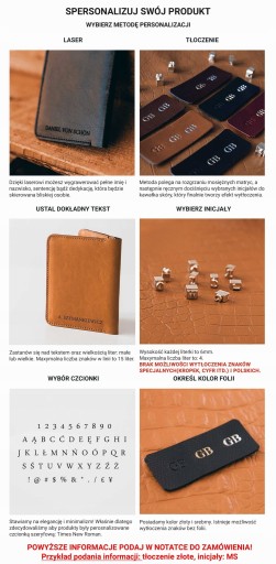 - W przypadku tłoczenia: prosimy o podanie koloru folii (srebrna, złota lub bez folii) oraz inicjałów.
