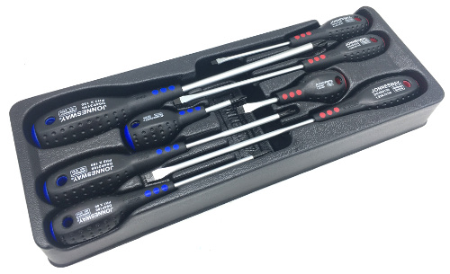 - zestaw wkrętaków dostarczany we wkładce narzędziowej, pasującej do szuflad skrzyń i wózków narzędziowych Jonnesway oraz Quatros