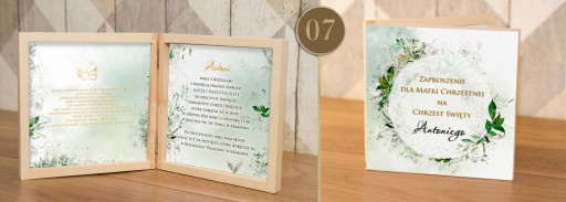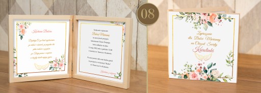 Zaproszenia w drewnianej skrzyneczce o wymiarach 14,5 x 14,5 cm.