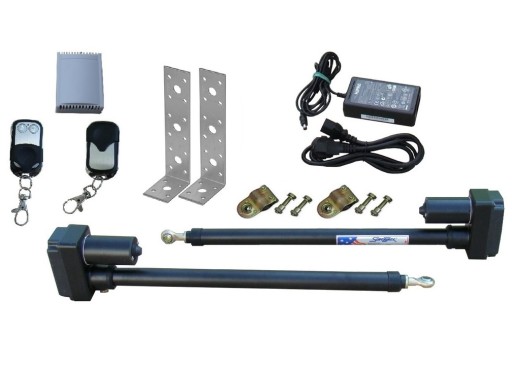 Oferowany zestaw przeznaczony jest dla bram 2 skrzydłowych. W zestawie jest gratis zasilacz 12V do sterowania jak i do zasilania samych siłowników. Siłowniki zasilane są z odbiornika zdalnego sterowania napięciem 12V co zapewnia wysokie bezpieczeństwo. Oczywiście w przypadku braku zasiania 230V możemy cały system zasilać z akumulatora 12V co zapewni działanie 24h na dobę niezależnie od naszego dostawcy prądu. Odbiornik zdalnego sterowania jak i zasilacz w razie umieszczenia na zewnątrz budynku należy umieścić w plastikowej obudowie hermetycznej.