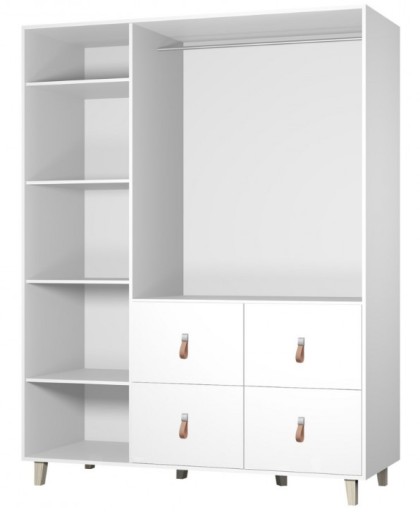 Szafa trzydrzwiowa FAGO łączy nowoczesny skandynawski styl z funkcjonalnością oraz komfortem codziennego użytkowania. Pakowna szafa z czterema szufladami, tradycyjnie otwieranymi drzwiami, wyposażona w półki i drążek ubraniowy.