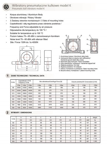Zasada działania wibratorów: wibrator typu K jest wibratorem kulowym. Wewnątrz osadzona jest kula, która pod wpływem sprężonego powietrza porusza się po bieżni wytwarzając wibracje. Powierzchnia bieżni i materiał, z którego zbudowana jest kula jest twardy i wolno zużywający się.