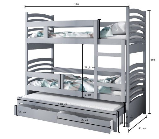 Łóżko piętrowe dla dzieci Janek 3 osobowe, powierzchnia spania 180x75 cm, 3 materace gratis!