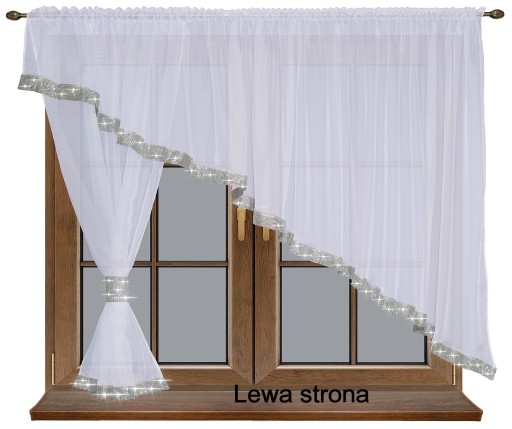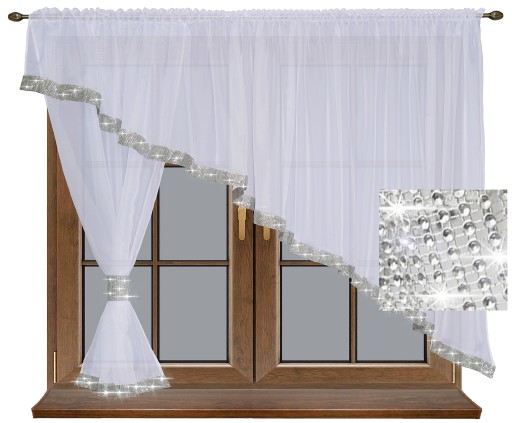 Oferujemy państwu firanę z białego woalu wykończona ozdobną taśmą z cyrkoniami, gotową do zawieszenia.