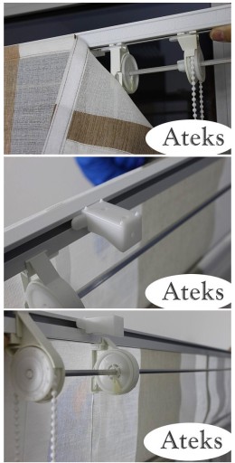 - roleta przyczepiona jest od góry na rzep do mechanizmu, całość po rozpakowaniu z paczki jest gotowa do zawieszenia po zamontowaniu do ściany bądź do sufitu, na dwa kołki montażowe (dołączone do zestawu).