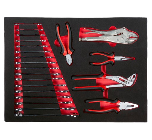Solidny wózek warsztatowy z siedmioma szufladami i wyposażeniem w najczęściej używane, profesjonalne narzędzia warsztatowe. Szuflady posiadają prowadnice z łożyskami kulkowymi, centralny zamek i blokady poszczególnych szuflad. Mobilność wózka zapewniają cztery duże, wytrzymałe kółka, w tym jedno z hamulcem.