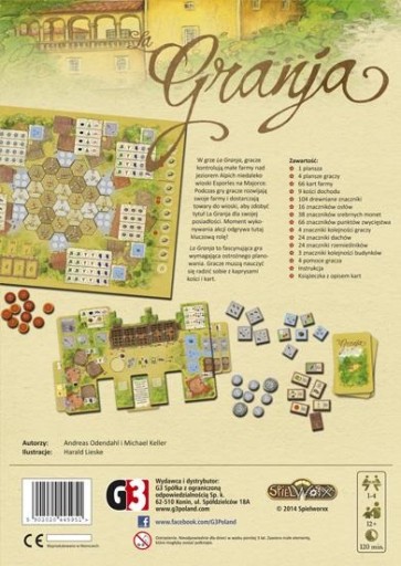Moment wykonywania akcji odgrywa tutaj kluczową rolę! Ten, kto zbierze najwięcej punktów zwycięstwa, wygrywa i otrzymuje tytuł La Granja dla swojej posiadłości! "La Granja" to fascynująca gra, wymagająca ostrożnego planowania. Gracze muszą obserwować akcje przeciwników, zmieniać kolejność w rundzie i nauczyć się radzić sobie z kaprysami kości i kart.
