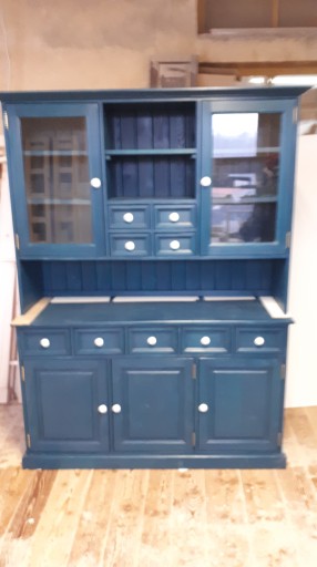 - Kredens Drewniany Składa się z dwóch części -nadstawki i komody oddzielonej od siebie blatem.Nadstawka Kredensu posiada przeszklone podwójne drzwi oraz polkę po środku,natomiast pod blatem znajdują sie trzy funkcjonalne szuflady wysuwane na drewnianych prowadnicach ,a pod nimi zamykane szafki.Całość wzbogacają ręcznie kute pordzewiałe zawiasy i uchwyty,które nadają duszy meblom z tej serii.