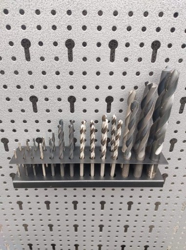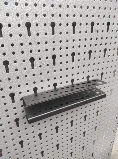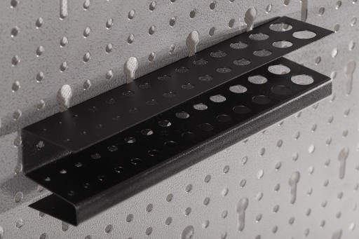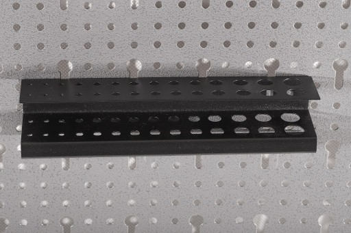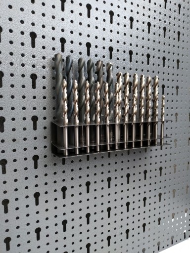 Uchwyt zawieszka blaszana o wymiarach 225x45x45 mm lakierowana metodą proszkową na kolor czarny. Zawieszka służy jako uchwyt na 28 sztuki wierteł.