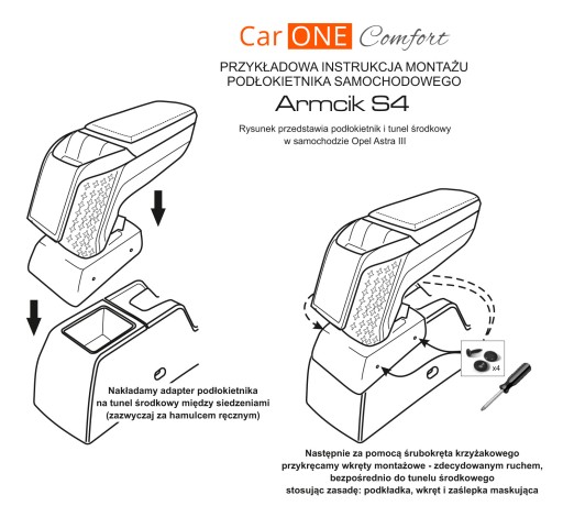 W zależności od posiadanego samochodu podłokietnik Armcik s4 posiada dedykowany adapter montażowy, który różni się od siebie kształtem szerokością i wysokością. Montaż podłokietnika w samochodzie jest bardzo prosty. W komplecie znajduje się zestaw montażowy: wkręty, podkładki, zaślepki. Montaż polega na bezpośrednim przykręceniu adapteru montażowego podłokietnika do tunelu środkowego za dźwignią hamulca ręcznego.