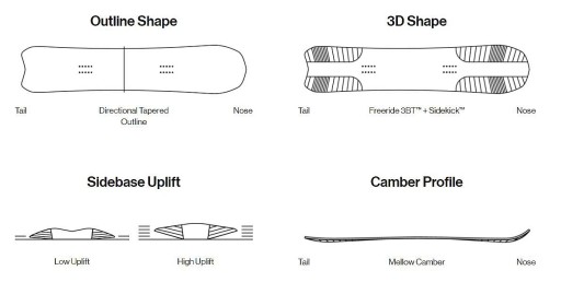 SideKick™ - radykalnie zwiększa boczne unoszenie w najszerszych punktach nosa i ogona. Ułatwia to manipulowanie deską w puchu i w nierównym terenie