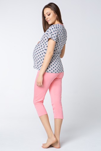 Piżama damska, która została stworzona dla kobiet w ciąży oraz mam karmiących. Została wykonana z bawełny oraz posiada dwie dyskretne kieszonki zapewniające komfort podczas karmienia. Bluzka posiada krótki rękaw i uroczy druk w gwiazdki, a do tego delikatne, gładkie spodnie. Komplet wykonany z najwyższej jakości materiałów.