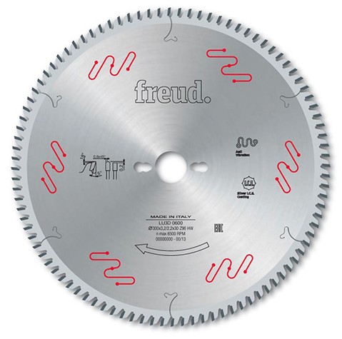Cechy: Specjalnie produkowane przez Freuda stopy tytanowo-kobaltowo-węglikowe (TiCo) zapewniają najwyższą jakość oraz trwałości narzędzia. Powłoka PermaShield zapewnia trwałą ochronę i zmniejsza przyczepność urobka oraz zabezpiecza przed przegrzaniem się. Laserowane nacięcia antywibracyjne gwarantują płynną pracę i ograniczają hałas. Specjalne lutowane złącze (Freud Tri-Metal) składa się z warstwy miedzi pomiędzy dwiema warstwami srebra, co zapewnia lepszą stabilność podczas silnych uderzeń. Stalowe ostrze z wyselekcjonowanej stali gwarantuje precyzję i długowieczność.