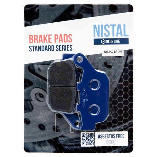Klocki hamulcowe marki NISTAL to bezpieczny i trwały produkt posiadający doskonały stosunek jakości do ceny. Okładzina to organiczny materiał cierny wzbogacony dodatkami poprawiającymi hamowanie. Klocki z niebieskiej serii BLUE LINE dzięki zawartości 20% miedzi, zapewniają dobre odprowadzanie ciepła, nie szarpią i nie piszczą podczas hamowania. Zapewniają łagodne zużywanie się tarczy. Sprawdzą się również w cięższych motocyklach do rekreacyjnej jazdy. Wytwarzane zgodnie z certyfikatami: ISO 9001:2008, ISO 14001:2004, OHSAS 18001:2007.
