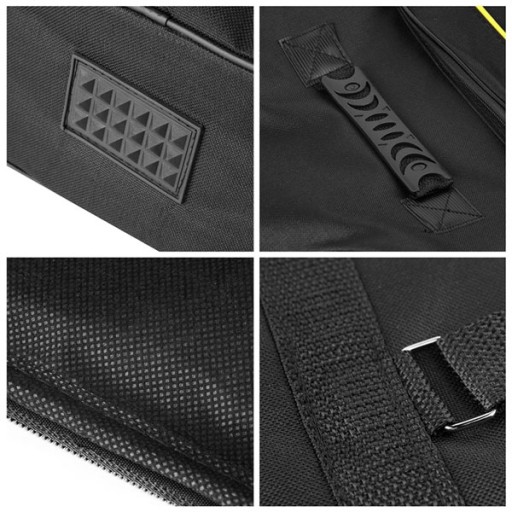 Posiada 2 kieszenie na akcesoria oraz regulowane szelki na plecach do wygodnego przenoszenia. Dodatkowo, na boku oraz froncie pokrowca znajdują się ucha (uchwyty) do przenoszenia futerału w ręku, zamiast na plecach.