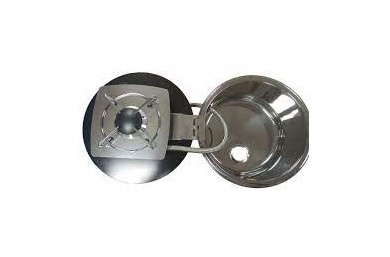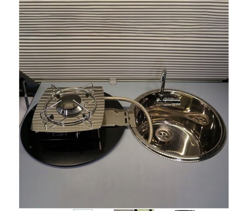 Kompaktowa, okrągła 1-palnikowa kuchenka na zawiasach ze stali nierdzewnej, wyposażony w samozamykającą się pokrywę, w komplecie ze zlewem i składanym kranem zimnej wody. Blat wyposażony jest w pokrywę ze szkła hartowanego.