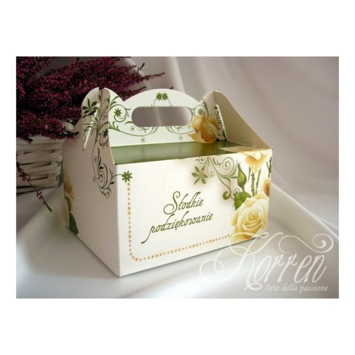 Śliczne pudełko na ciasto w kolorze białym z delikatnym nadrukiem oraz z napisem "Słodkie podziękowanie"