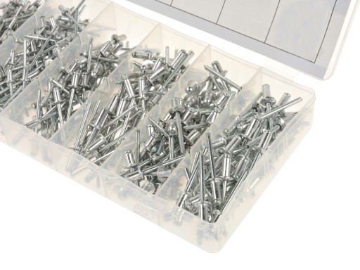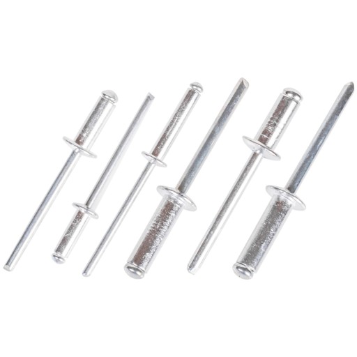 Zestaw nitów aluminiowych zrywalnych w różnych rozmiarach.