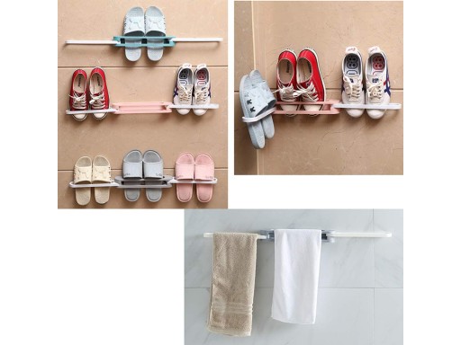 Uchwyt można zawiesić za pomocą mocnej taśmy dołączonej do zestawu w bardzo szybki sposób, wystarczy przykleić uchwyt do ściany i gotowe. Konstrukcja składana zapewnia dopasowanie odpowiedniej ilości kapci lub ręczników.