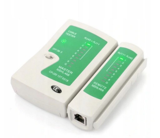 Tester kabli- kompaktowy i lekki, wymiary 10.5 cm x 5 cm. Złożony z dwóch części. Do testowania kabli UTP, FTP, STP oraz kabli telefonicznych RJ12 i RJ 11.