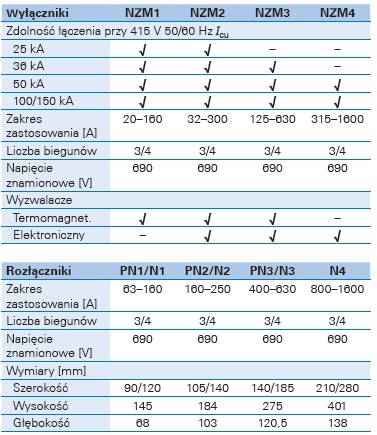 Wyłączniki kompaktowe NZM o prądach znamionowych od 20 do 1600 A służą do zabezpieczania obwodów przed skutkami przeciążeń i zwarć. Pod względem funkcjonalności mogą być wykorzystywane jako zasilające, odpływowe oraz sprzęgłowe. Różnorodność wykonań umożliwia użycie ich do zabezpieczeń instalacji, silników, generatorów czy transformatorów. Cztery wielkości kompaktowe, wersje 3- i 4-biegunowe, zdolność zwarciowa do 150 kA w połączeniu z nowoczesną konstrukcją,małymi wymiarami i prostotą montażu osprzętuumożliwia pracę w najcięższych warunkach.Wyłączniki z wyzwalaczami elektronicznymiw standardzie umożliwiają wykorzystanierozbudowanych możliwości komunikacyjnychi diagnostyki.