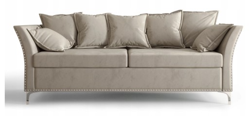 Prezentowana sofa to rodzaj mebla wolnostojącego, zarówno tył jak i przednia część zostały wykonane przy użyciu tej samej tkaniny, co pozwoli Ci na ustawienie jej w dowolnym miejscu. Siedzisko składa się ze sprężyny falistej, a wypełnione zostało pianką HR - 35, która zapewnia miękkość, wygodę oraz odporność na wszelkiego rodzaju odkształcenia. Poduszki oparciowe natomiast wypełnione zostały sylikonem, który nadaje im sprężystości, a co za tym idzie zapewnia niebywale wygodne oparcie. Ponadto zostały wykończone piękną falistą lamówką. Eleganckie odchylone boczki oraz front mebla wykończono ozdobnymi pinezkami, które pięknie podkreślają krawędzie sofy oraz dostępne są w pięciu wariantach kolorystycznych.