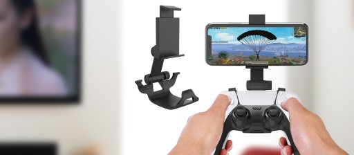 Uchwyt pozwala wygodnie i komfortowo grać na telefonie przy użyciu kontrolera od konsoli PlayStation 5 / PS5.