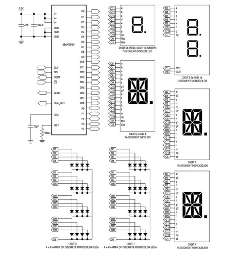 MAX6954 to kompaktowy sterownik ekranu, który łączy się ze sobą mikroprocesory do mieszanki 7-segmentowej, 14-segmentowej, i 16-segmentowe wyświetlacze LED poprzez SPI- / 4-przewodowy interfejs szeregowy QSPI ™. Serial interfejs może być kaskadowany przez wiele urządzeń. MAX6954 obsługuje do 16 cyfr 7-segmentowych, 8 cyfr 14-segmentowy, 8-cyfrowy 16-segmentowy lub 128 dyskretny Diody LED, działając z napięcia zasilania tak niskiego jak 2,7V. Sterownik zawiera pięć ekspanderów wejść / wyjść (lub GPIO) linie, z których niektóre lub wszystkie mogą być skonfigurowane jako czytnik kluczy, który automatycznie skanuje i rozwiązuje macierz złożoną z maksymalnie 32 przełączników. Zawarte na chipie są pełne 14- i 16-segmentowe ASCII Czcionki 104-znakowe, szesnastkowa czcionka dla 7-segmentów wyświetlacze, układy wieloczęściowego obwodu skanującego, sterowniki anod i katod, i statyczną pamięć RAM, która przechowuje każdą cyfrę. Maksymalny Prąd segmentowy dla cyfr wyświetlacza jest ustawiany za pomocą pojedynczego zewnętrzny rezystor. Intensywność cyfr może być niezależna dostosowane za pomocą 16-stopniowej wewnętrznej kontroli jasności cyfrowej. MAX6954 zawiera tryb wyłączania o niskiej mocy, rejestr limitu skanowania, który pozwala użytkownikowi wyświetlić z 1 do 16 cyfr, migające segmenty (synchronizowane między wieloma sterowniki, jeśli jest to pożądane) i tryb testowy, który wymusza wszystkie Diody LED włączone. Sterowniki LED mają ograniczoną prędkość obrotową, aby zmniejszyć EMI.