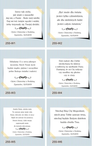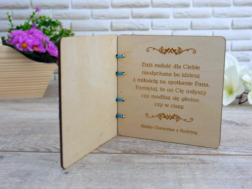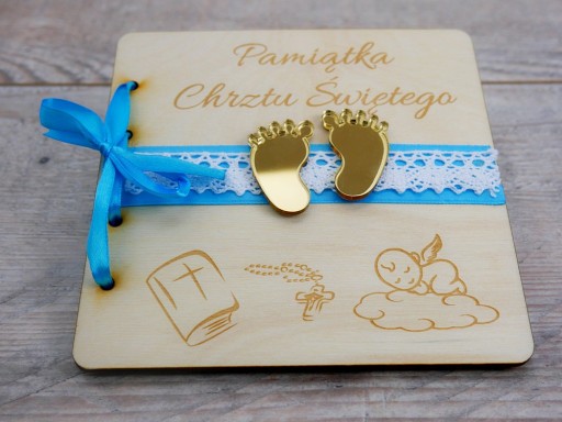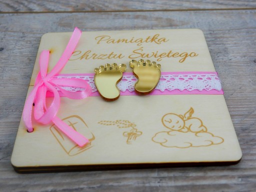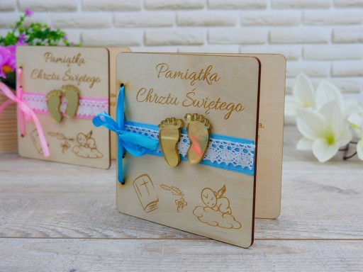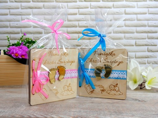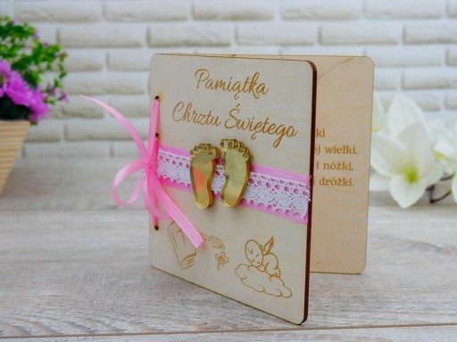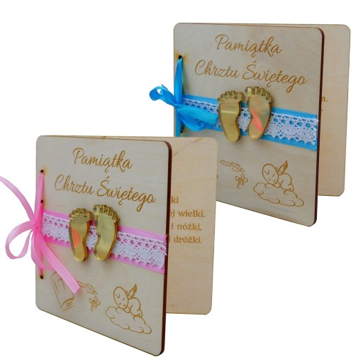 Szukasz ciekawego pomysłu na prezent dla Chrześniaka lub Chrześniaczki? Proponujemy piękny prezent-Pamiątkę tego wspaniałego dnia jakim jest Chrzest Święty. Pamiątka została wykonana z drewna sosnowego ozdobiona błyszczącymi stopkami w złotym kolorze umieszczonymi na ozdobnej kokardzie oraz wygrawerowana za pomocą lasera. Na przedzie Kartki umieszczamy Pamiątka Chrztu Świętego pod nim wspomniane stopki, motywy religijne, imię dziecka grawerujemy pod stopkami. Wewnątrz możemy wygrawerować dowolne życzenia oraz podpis, przygotowaliśmy też klika wierszyków na tę wspaniałą okazję.