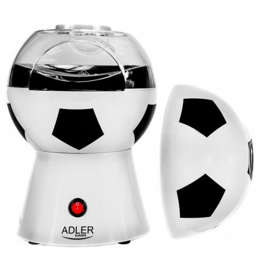 Urządzenie ADLER AD4479 do przygotowania popcornu w kształcie piłki nożnej, wyróżnia się nie powtarzalnym wzornictwem, który na pewno ucieszy fanów oglądających przed ekranem mecze piłkarskich rozgrywek. Jednocześnie przygotowanie popcornu jest szybkie oraz, co najważniejsze – beztłuszczowe. Dzięki temu możesz cieszyć się kukurydzą prażoną w zdrowy sposób. Pokrywa zewnętrzna pełni jednocześnie rolę miski, w której podasz popcorn domownikom lub zaproszonym gościom.