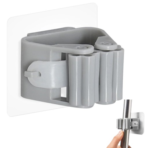 - Praktyczny uchwyt na mopa wykonany z tworzywa sztucznego oraz gumowej, samoprzylepnej podkładki.
