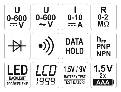 - test tranzystorów hFe: 0-1000, wbudowane gniazdo pomiarowe