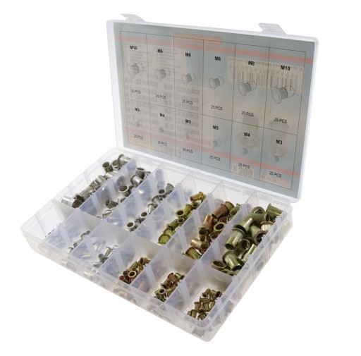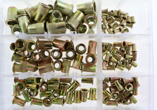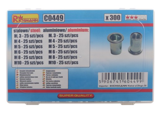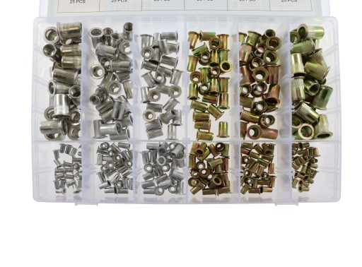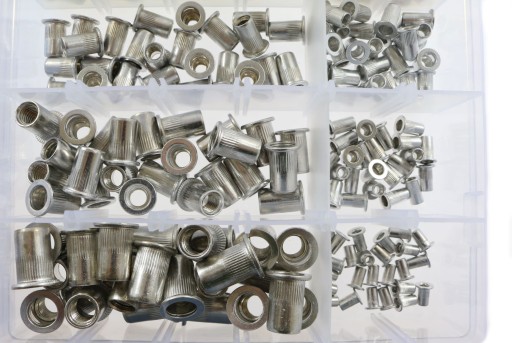 Zestaw zawiera 150szt. nitonakrętek stalowych oraz 150szt. nitonakrętek aluminiowych.