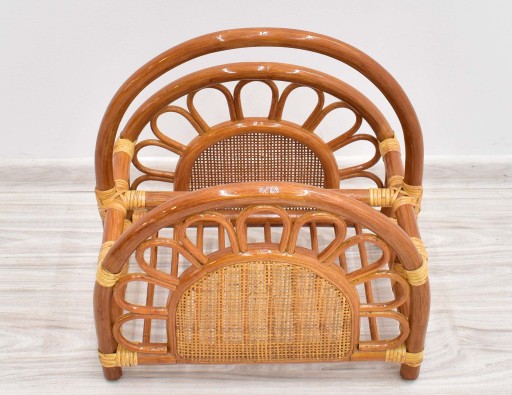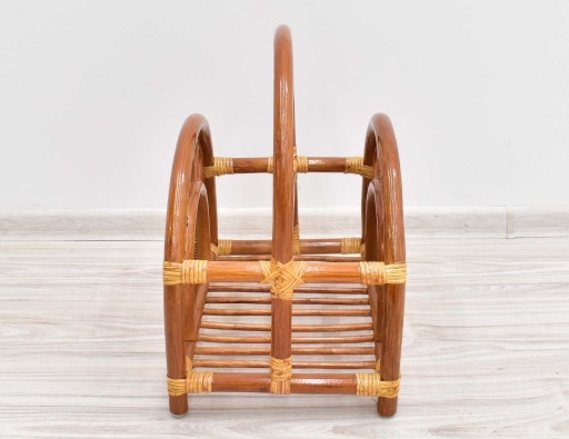 Piękny nietuzinkowy gazetnik rattanowy, lakierowany, w kolorze koniaku. Mebel ręcznie wytworzony w manufakturze w Indonezji.